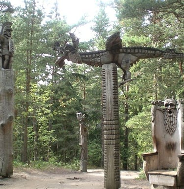 Medinių skulptūrų takas miške – mitologiniai personažai, raganos, velniai. Puiki pramoga šeimoms su vaikais.